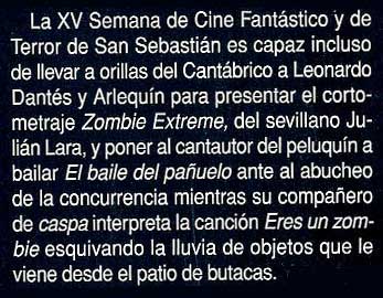 Artículo sobre la rueda de prensa de presentación de "Zombie Xtreme". Como podéis comprobar en la foto que reproducimos el titular está equivocado ya que ponen "Joaquín Lara" cuando es evidente que tenía que poner Julián Lara. INTERVIÚ, DEL 15 AL 21 DE NOVIEMBRE DE 2004, Nº 1490